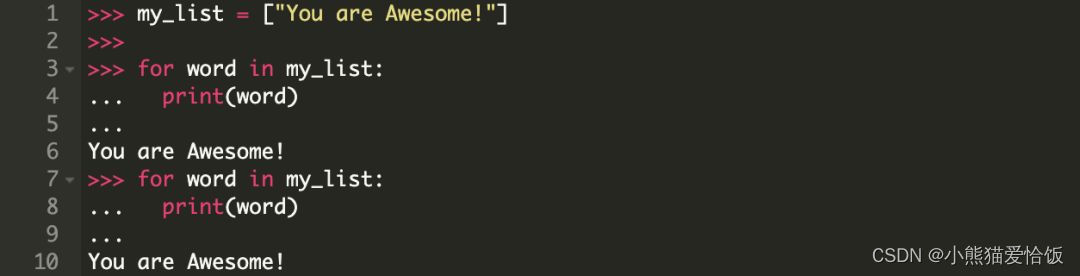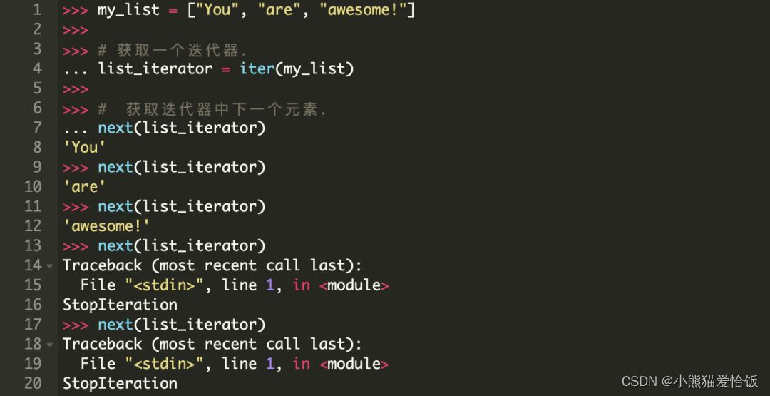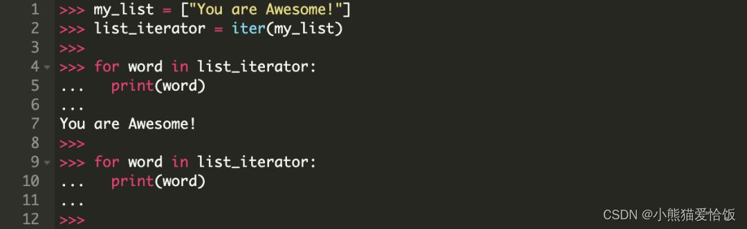 在 for 语句内部对列表 [“You”, “are”, “awesome!”] 调用了 iter() 方法,返回结果是一个迭代器。