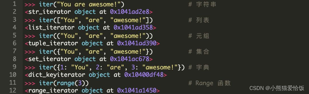 Python 中,一个 iterable 对象指在 for 循环中可以被迭代的任意对象。这意味着,当这个对象作为参数传递给 iter()方法时应该返回一个迭代器。我们来看一下 Python 中的一些常用的内置迭代的例子。
