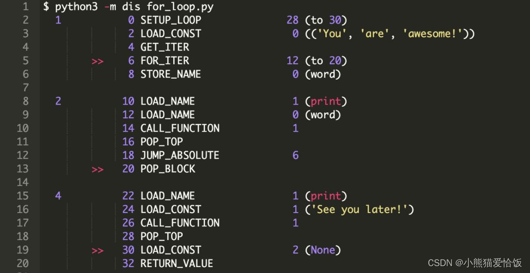 最后,我们将反编译一个简单的 for 循环,并逐步介绍 Python 解释器在执行 for 循环时执行的指令,以满足大家的好奇心。这些有助于理解 for 循环运行时的内部工作原理。