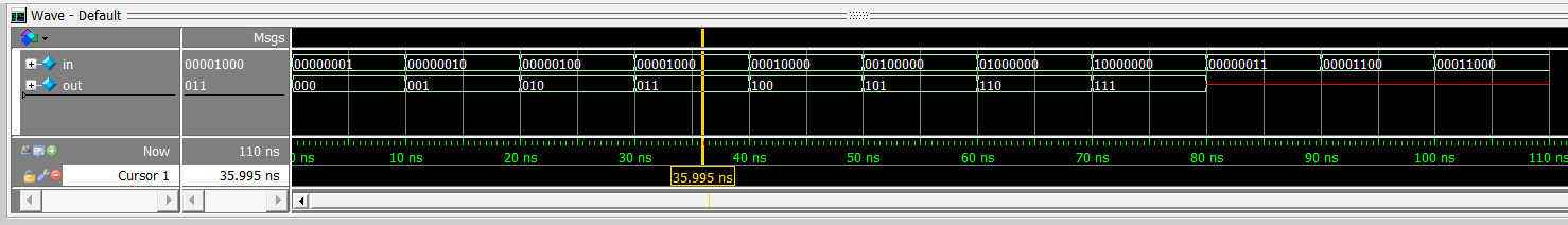 仿真结果如上图所示,初始化激励信号x为0000_0001,每延迟10ns,激励信号左移一位,重复7次,每次输入仅有1位有效输入,输出有效编码依次是000,001,010,011,100,101,110,111。第80ns时,x 输入中有多个位为1,输出将是未定义的状态。