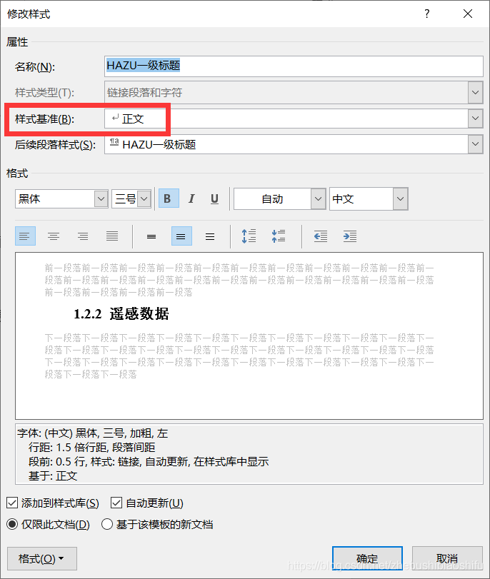 随后发现,这是由于所用的标题样式具有问题导致的。打开标题的样式,可以看到“样式基准”是正文,因此正文缩进了,标题也跟着缩进了。