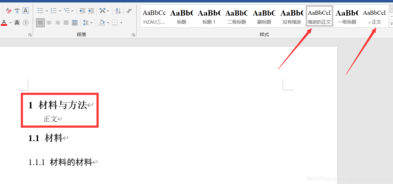 然后,我们在今后需要用到正文的时候,直接选择刚刚新建的“缩进的正文”,而不要选择“正文”,如下图。可以看到,此时,正文是缩进的,而标题没有缩进。