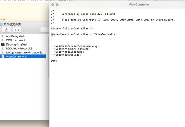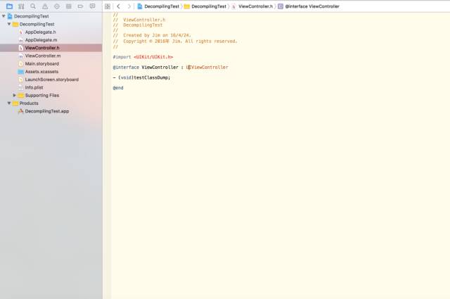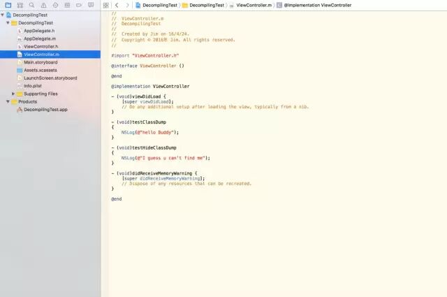 由代码可以看出,我就写了两个方法testClassDump和testHideClassDump,后者没有声明在.h中(ps:我想试验这样能不能被反编译到)。