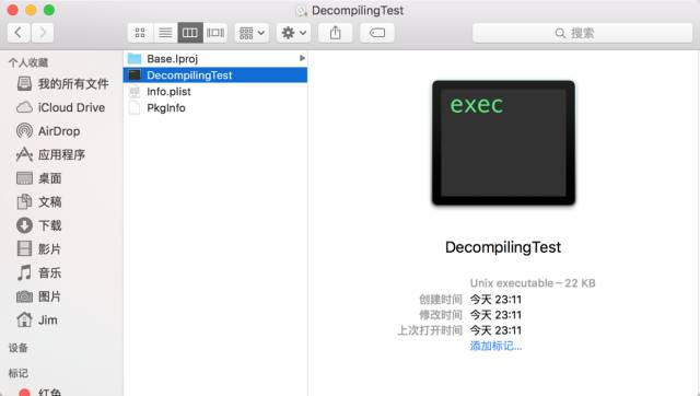 我们run一下工程,然后打开Products文件夹下的DecompilingTest.app所在目录,显示包内容,拿到二进制文件。