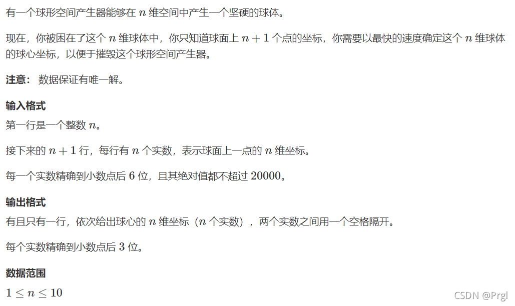 Description 有一个球形空间产生器能够在n维空间中产生一个坚硬的球体.现在,你被困在了这个n维球体中,你只知道球面上n+1个点的坐标,你需要以最快的速度确定这个n维球体的球心坐标,以便于摧毁 ...