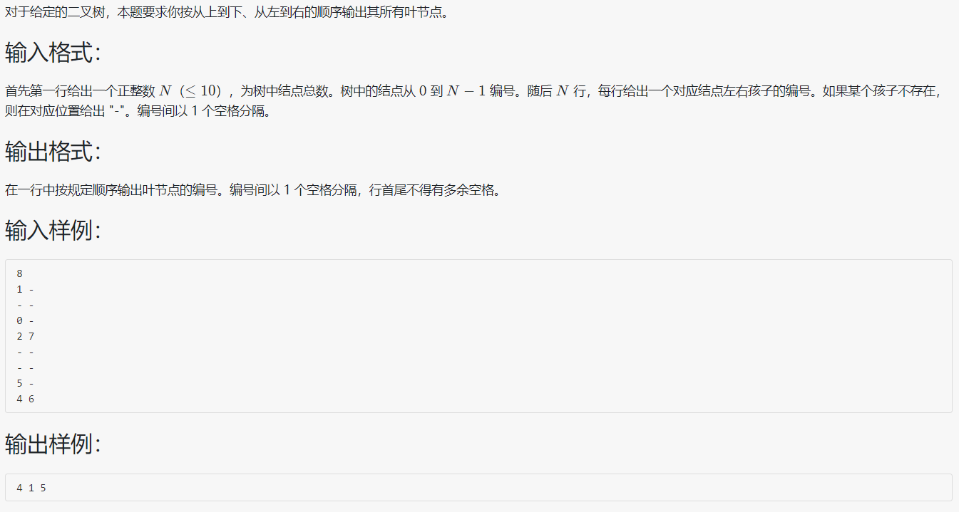 按从上到下、从左到右的顺序输出,则是层序遍历的顺序,这里需要用到队列。首先需要根据输入找出根节点,将输入利用静态链表的方式保存,没有被指向的编号就是根节点。然后再根据层序遍历遍历树,若该节点为叶子节点则将其编号保存,最后输出。