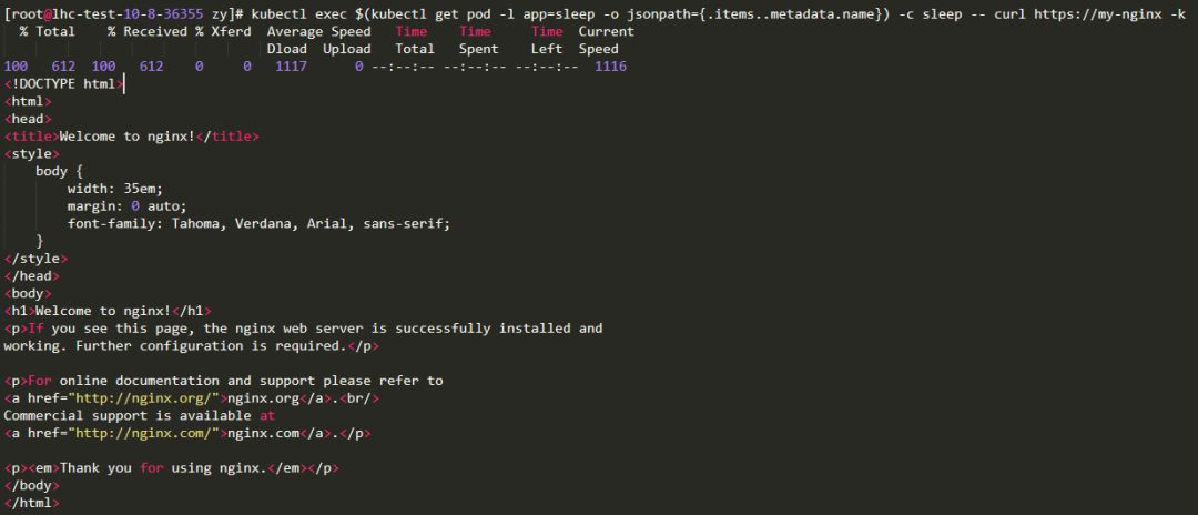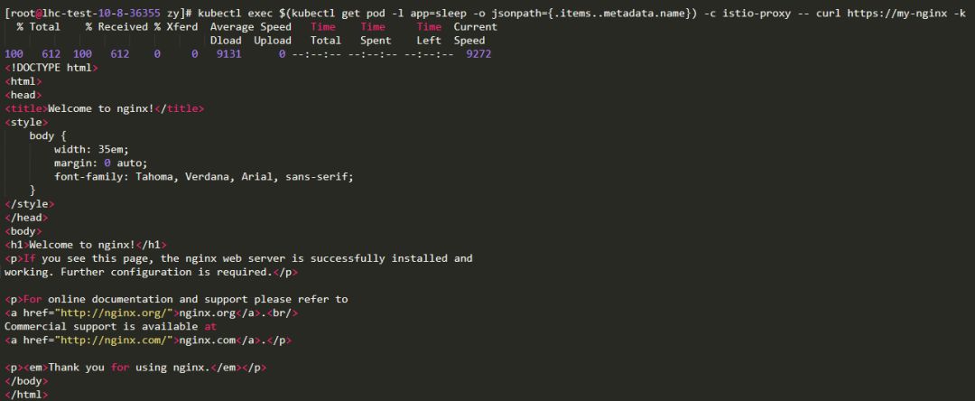 此时,网格中的所有服务已经开启了双向TLS功能,从sleep容器中访问nginx是正常的: