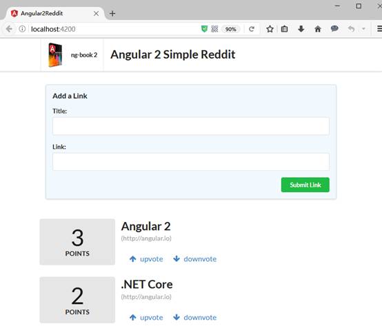 a) 运行ng new –ng4angular-reddit创建应用,从随书代码中复制样式文件,新建组件app-root,代码为: