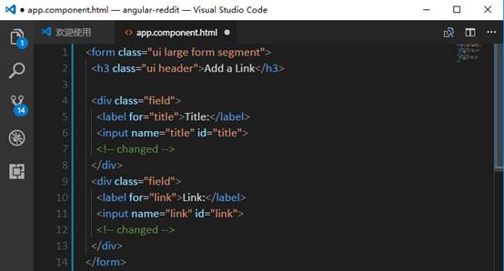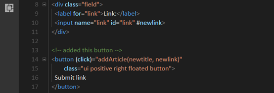 b) 对于界面输入的数据,获取的方式有点特别,使用了#newlink这样的语法,newlink是一个对象,现在代表就是所在的input这个DOM元素。