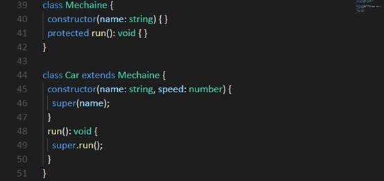 Car继承了Mechaine,使用extends关键字,通过super初始化父类或调用父类方法。父类的run方法就算不写修饰符也可以被派生类使用,猜想TypeScript中方法的默认修饰符是protected。