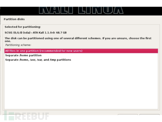 磁盘分区可以在系统发生故障的情况下依然保障系统的性能和安全性。在下图中,你可以看到Kali Linux在安装的过程中所提供的分区选项。