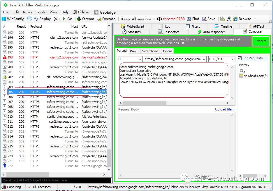 5.拖动一个会话,到右侧的Composer窗口,点击Execute可以再次执行该会话