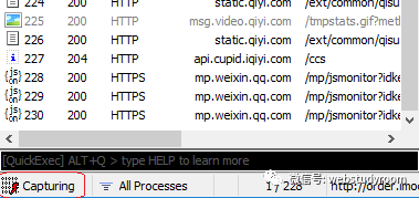 8. 停止、恢复拦截请求,点击左下角的状态即可完成切换。Capturing代表正在拦截。当放置一段时间,拦截失效的情况下,也可以重新点击下这里,再次启动拦截会话。