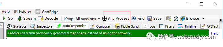 4. 只拦截某个进程的会话。比如只拦截chrome的会话,拖动Any Process到chrome窗口中即可。