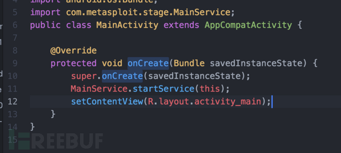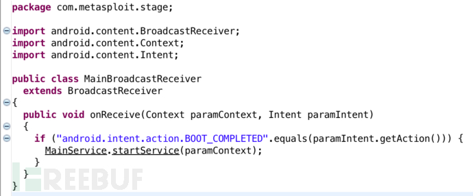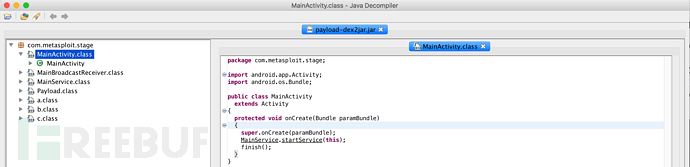 结合AndroidManifest.xml分析源码后发现,Payload的服务为com.metasploit.stage.MainService,启动服务的方式有两种,一个是主Activity(android.intent.action.MAIN),也就是点击程序图标后运行的Activity,另一个是接收android.intent.action.BOOT_COMPLETED,也就是开机自动启动服务。