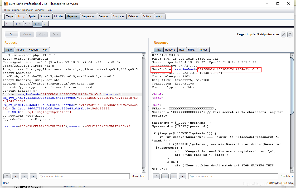 我们看下面的setcookie是md5($secret . urldecode("admin" . "admin")),意思是cookie是$secret连接上adminadmin的MD5加密,而还要求cookie为$secret连接上admin再连接上另一个不为admin的字符串的MD5加密。