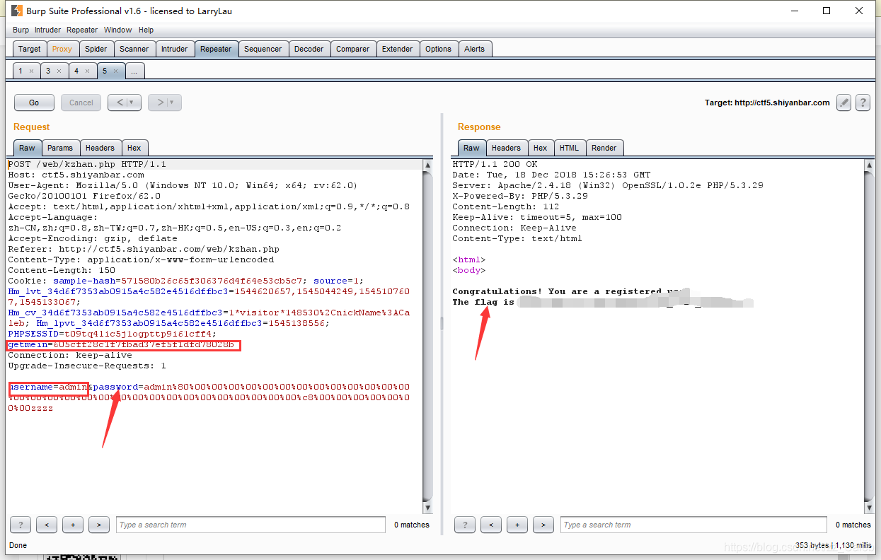 意思就是username为admin,password不为admin,且$COOKIE["getmein"] === md5($secret . urldecode($username . $password))。