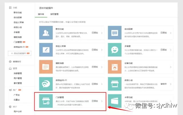 2、进入后选择“门店管理”插件,点击“申请开通”。若您的公众号符合相关资质(初期向有认证资质的服务号及有卡券功能的公众号开放),该功能将即时开通。