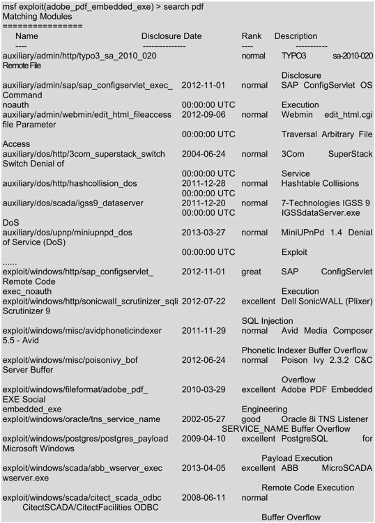 以上信息显示了PostgreSQL所有相关的模块。此时可以选择相应的模块进行攻击。