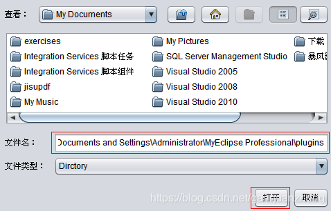 复制“C:\Documents and Settings\Administrator\MyEclipse Professional\plugins”到下图的输入框内,
