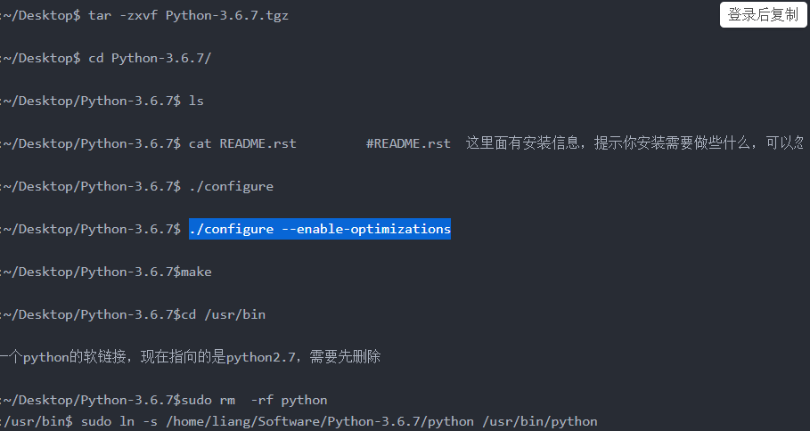 8. 新建python的软连接 指向我们make出来的python可执行文件 sudo ln -s /home/liang/Software/Python-3.6.7/python /usr/bin/python