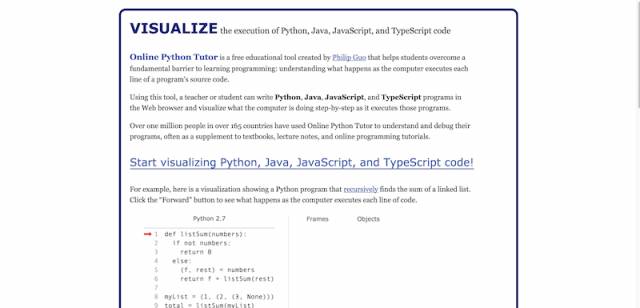 我认为这是新手程序员近期能够上手的最好的项目之一,Python Tutor都是在教你当执行你写的代码时到底发生了些什么。清楚地了解到如何写一段程序,能够理解后台程序的每个命令都是截然不同的。你可以使用自己写的代码,也可以使用平台提供的代码。