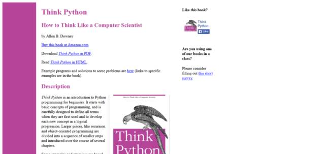 在这个链接里你会发现有大量的示例代码。它是最为专业的书之一,它有一个很严肃的原则: “像计算机科学家一样思考”。它需要将近40美元才能买到,但是你可以下载免费的PDF和HTML版本。如果从头开始学Python的话,肯定会从它上面得到好处。