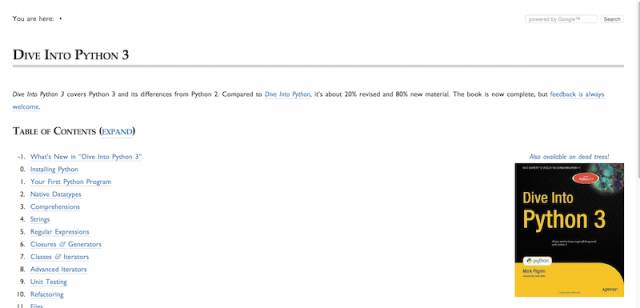 Pythonspot是一个综合教程,划分了很多不同类别的知识板块,首先你将拥有初学者资源来帮你开始Python的学习,然后你继续保持前进你能学到更多关于使用Python开发web,创建图形界面,开发游戏的内容,到那时你可以准备学习一些更高级的板块,像网络等等。这些都在一个地方,非常容易使用。