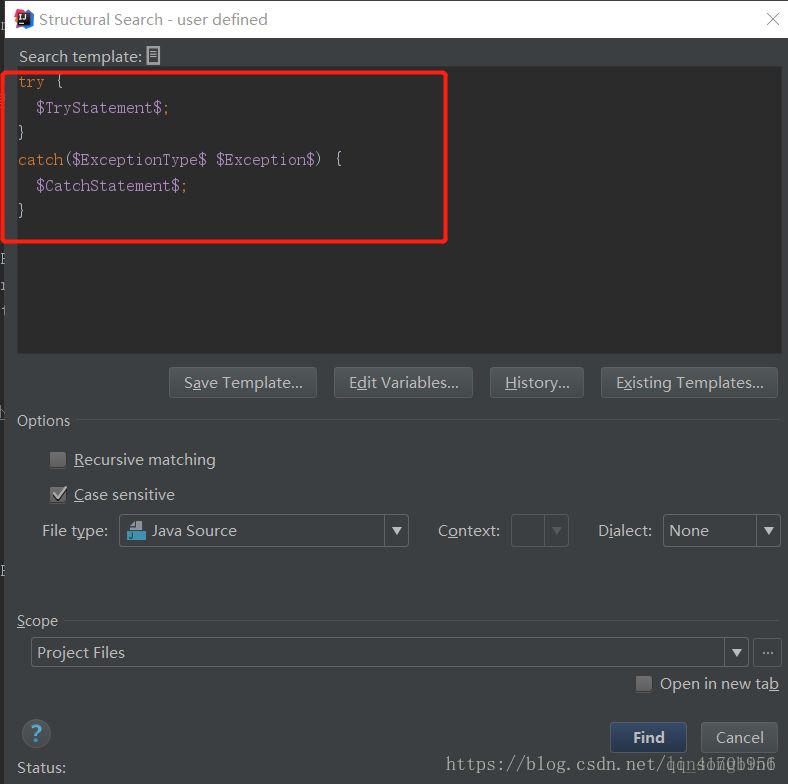 点击Existing Templates按钮,选择try模板。为了能找出catch里面没有处理异常的代码块,我们需要配置一下CatchStatement的Maximum count的值,将其设置为1。