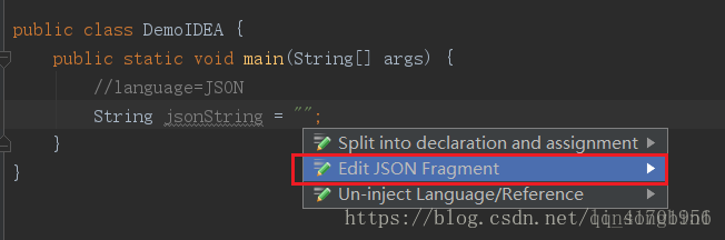 如果你使用IDEA在编写JSON字符串的时候,然后要一个一个去转义双引号的话,就实在太不应该了,又烦又容易出错。在IDEA可以使用Inject language帮我们自动转义双引号。