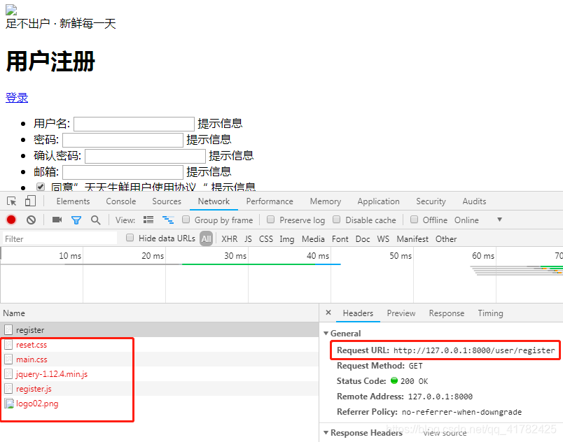- step4 运行项目,在浏览器中输入http://127.0.0.1:8000/user/register后,将注册页面渲染到浏览器上