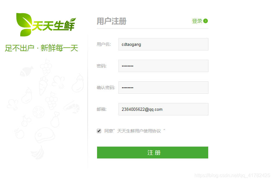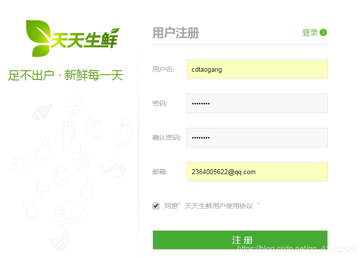 说明:前端注册页面使用js对密码长度和两次密码是否一致以及邮箱地址是否同意都进行了校验