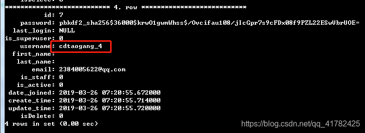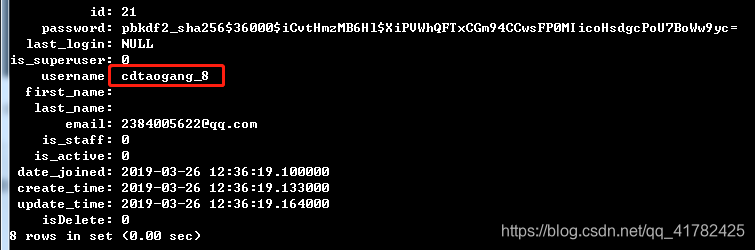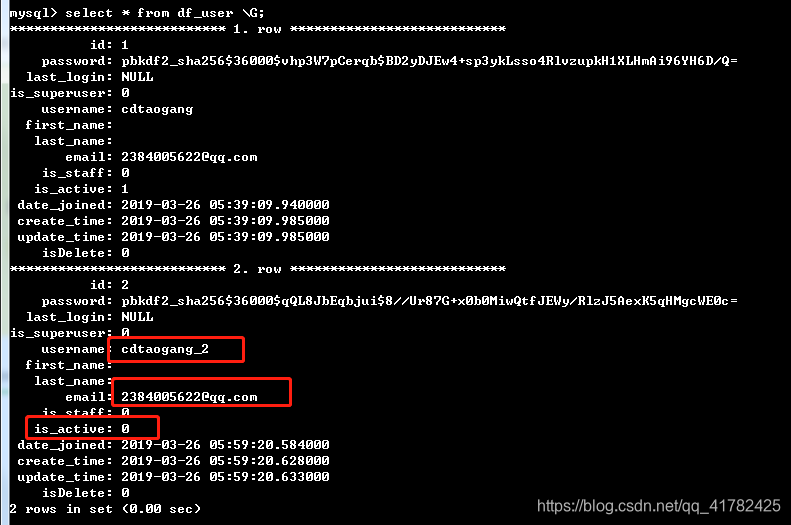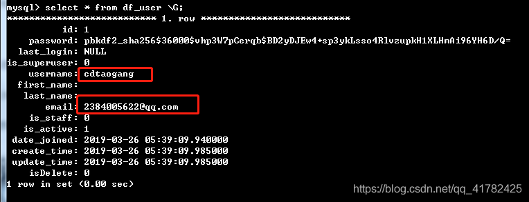 - step13 查看数据库df_user表数据,因为使用了django认证系统也就通俗点说在df_user/models中的User类继承了AbstractUser类,所以django的认证系统已经将用户注册时填写的密码进行加密处理后存到数据库,这样我们就不用在视图函数中获取密码并加密然后再保存到数据库表中
