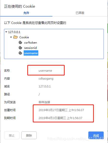 - step5 勾选记住用户名后,查看网站cookie看到刚设置的名为username的cookie了