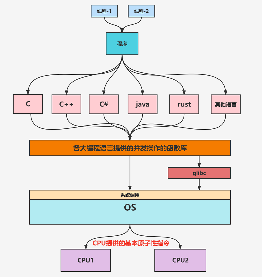 只有CPU提供了原子性指令,上层应用才能够根据这些指令来设计出指令段与指令段之间的原子性操作。这是一种自底向上的设计,没有CPU最底层的支持,上层应用根本就无法解决并发问题。应用程序使用自身语言提供的并发操作函数库,比如java的juc包,而这些函数库又会封装OS的系统调用或者使用glibc库,OS的系统调用最终会使用CPU提供的原子性指令。