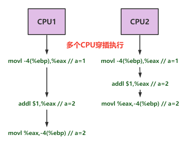 2.现在两个CPU要执行程序A的同一段代码,比如对变量a执行加1操作,代码a=a+1经过汇编器编译之后就是如下指令片段:addl $1,-4(%esp);