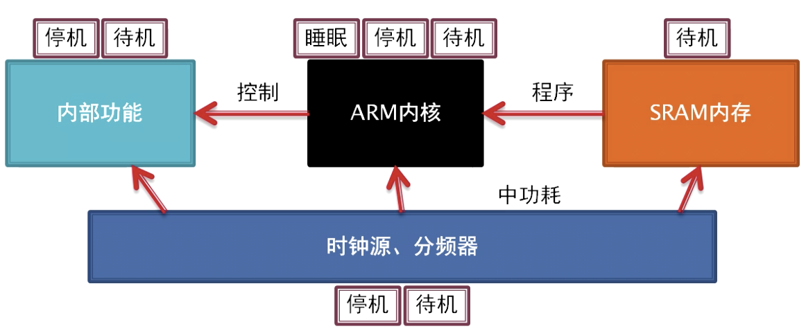 功耗差距(参考):正常模式10mA→睡眠2mA→停机模式20μA→待机模式2μA