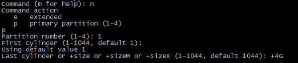 出现“Last cylinder or +size or +sizeM or +sizeK (n-xxx, default xxx):”表示分区的结束位置,我也可以输入cylinder表示结束也可以输入要分区的大小,后面可以跟(M,K,G)。列入4G,我们只要在后面输入“+4G”,注意一定要有加好和单位要大写。