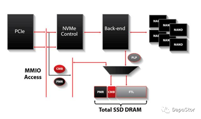 NVMe一直在积极探索固态硬盘内DRAM的其他用途,PMR就是一个潜在的应用。绝大多数企业级固态硬盘都带有一定数量的DRAM内存,用来当做存放FTL表项的cache buffer,固态硬盘可以通过这些FTL表项来映射逻辑地址和闪存物理地址。此外,NVMe 1.2协议就定义了控制器内缓存CMB(Controller Memory Buffer)这一特性,旨在使部分SSD内的DRAM空间可以直接通过PCI地址空间被访问,这一特性使得NVMe传输IO命令所需的SQ,CQ可以直接驻存在SSD的DRAM内存里,而不是放在host的内存里,可以减少命令交互的延迟,并可以消除NVMe over Fabrics情况下SSD端对端之间DMA传输中的不必要的复制操作,使得传输的数据完全绕过host的DRAM。