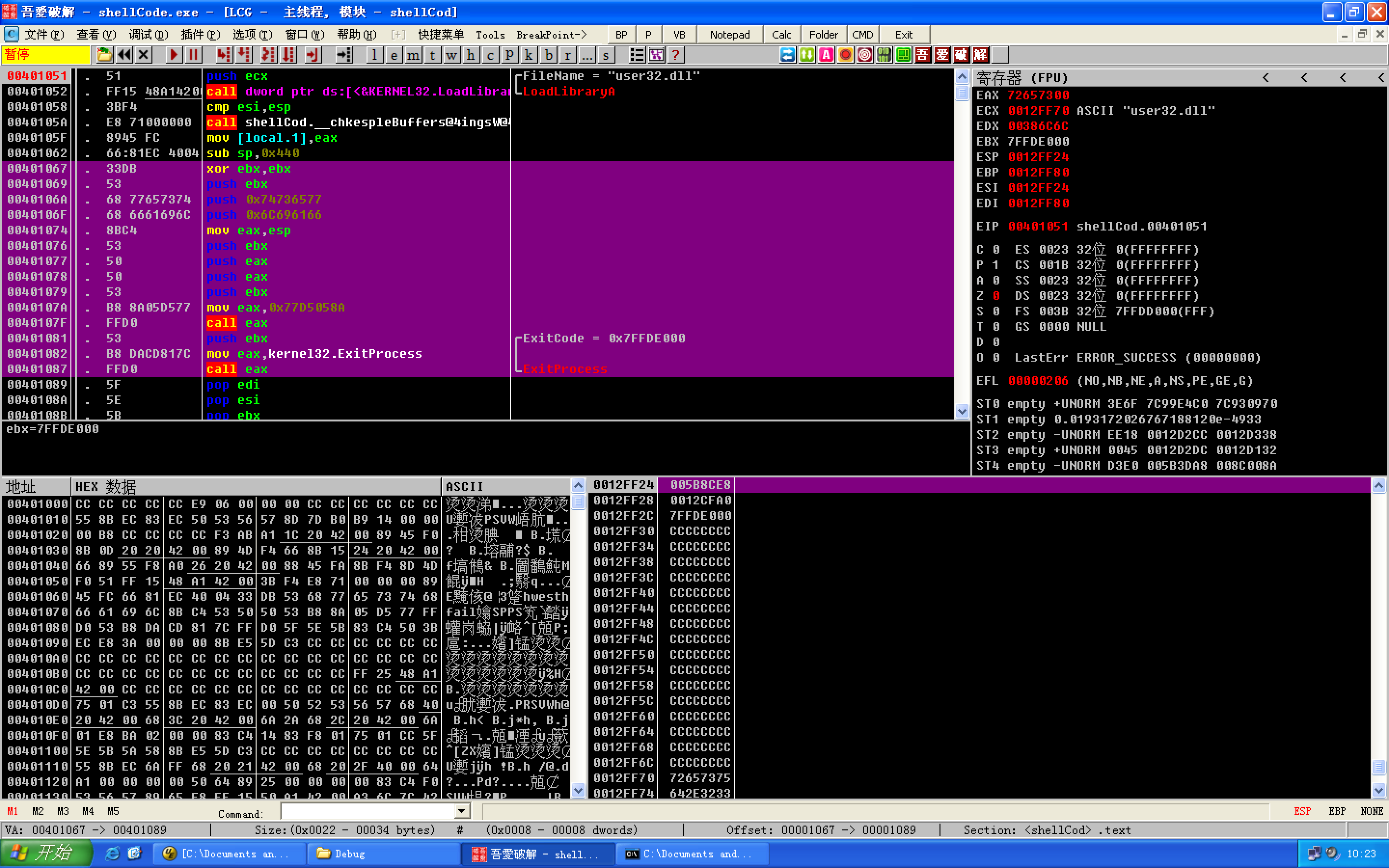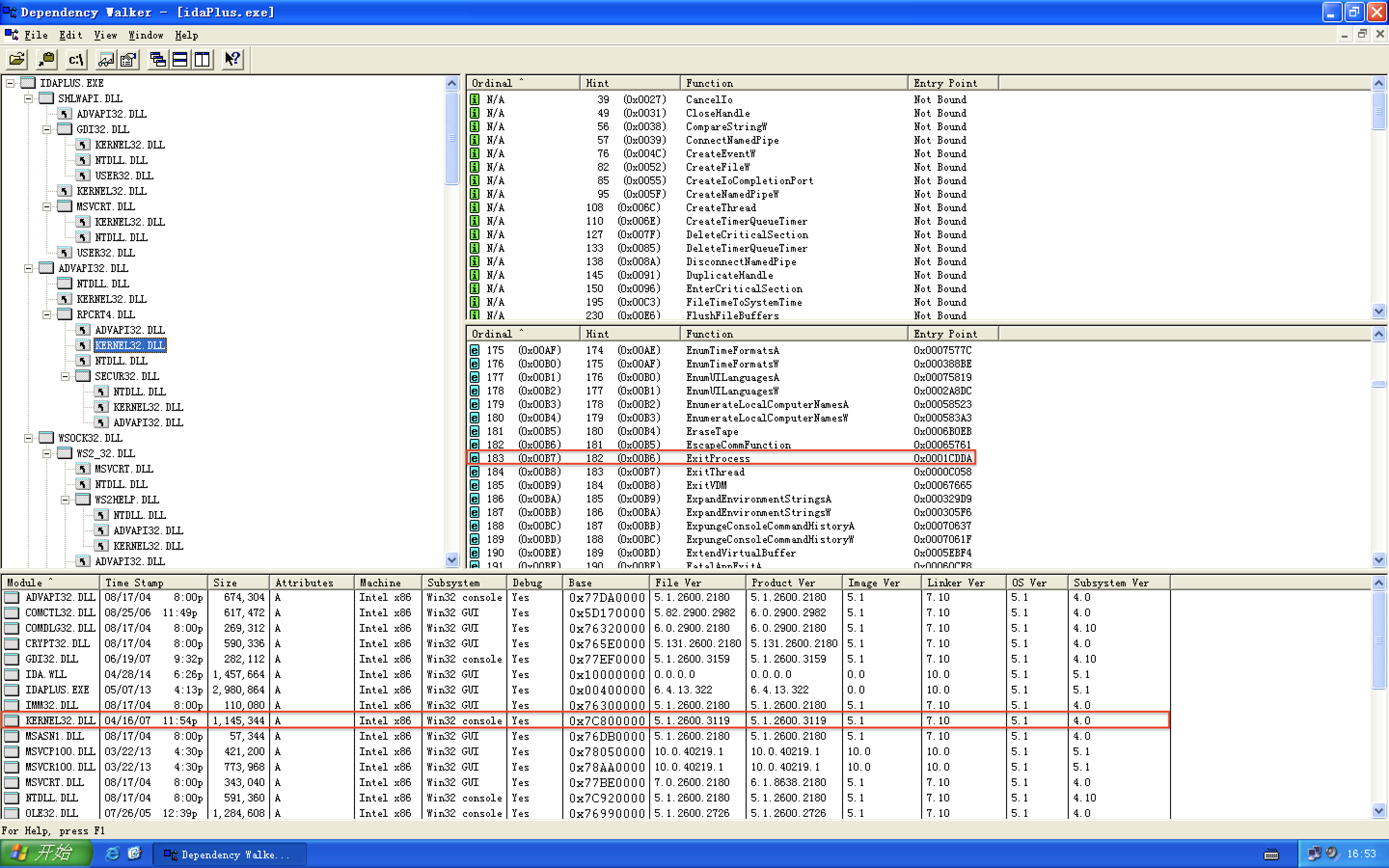 使用dependency walker获得ExitProcess函数入口地址 0x7c81cdda。