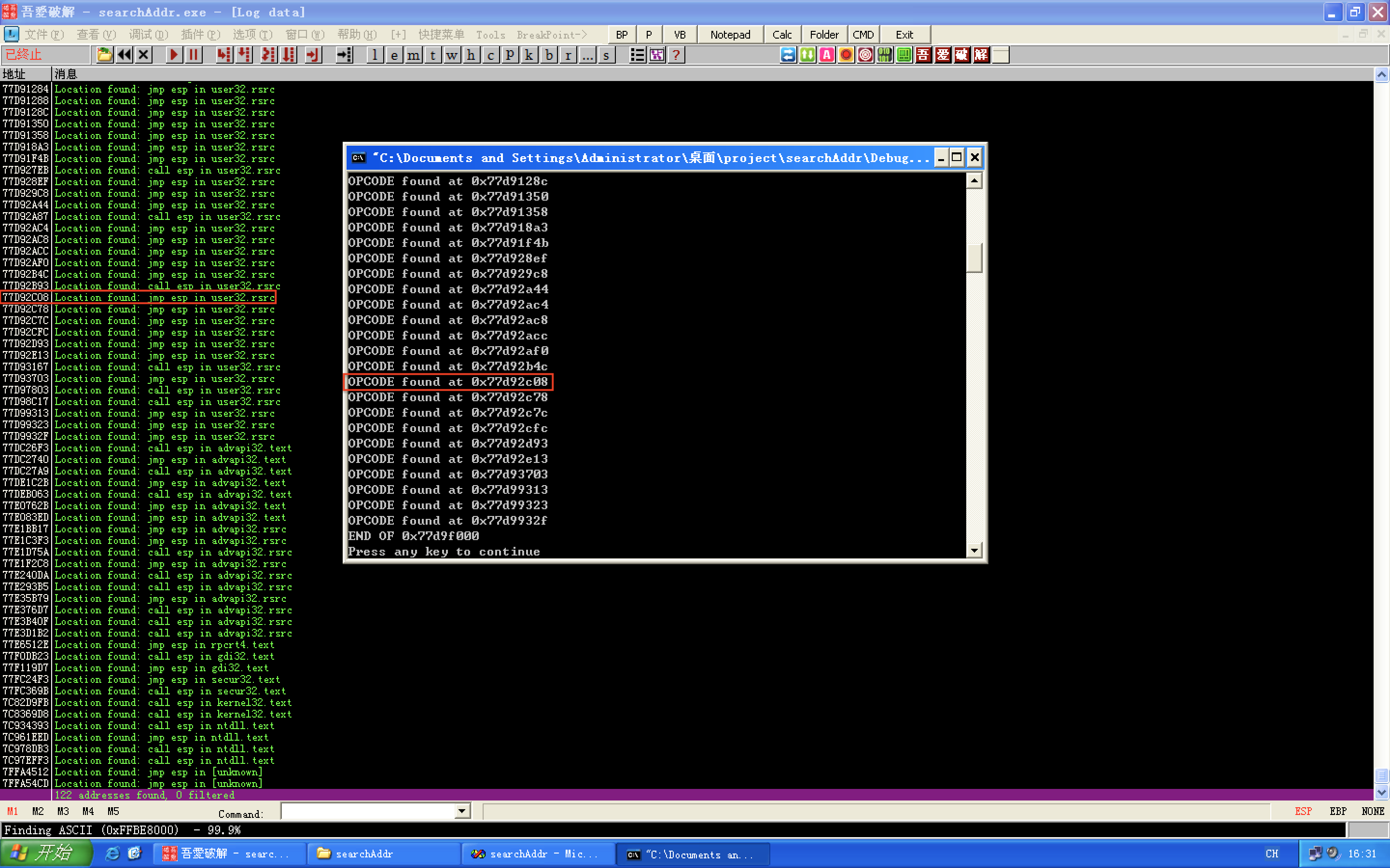 #include <windows.h> #include <stdio.h> #define DLL_NAME "user32.dll" main() { BYTE* ptr; int position, address; HINSTANCE handle; BOOL done_flag = FALSE; handle = LoadLibrary(DLL_NAME); if(!handle) { printf(" load dll erro !"); exit(0); } ptr = (BYTE*)handle; for(position = 0; !done_flag; position++) { try { if(ptr[position] == 0xFF && ptr[position+1] == 0xE4) { // 0xFFE4 is the opcode of jmp esp int address = (int)ptr + position; printf("OPCODE found at 0x%x\n",address); } } catch(...) { int address = (int)ptr + position; printf("END OF 0x%x\n", address); done_flag = true; } } }将searchAddr.c文件在vc6.0中编译运行。产生的.exe文件我们放到OllyDbg调试。运行我们自己编写程序搜索跳转地址得到的结果和 OllyDbg 插件搜到的结果基本相同,如图 3.2.5 所示。