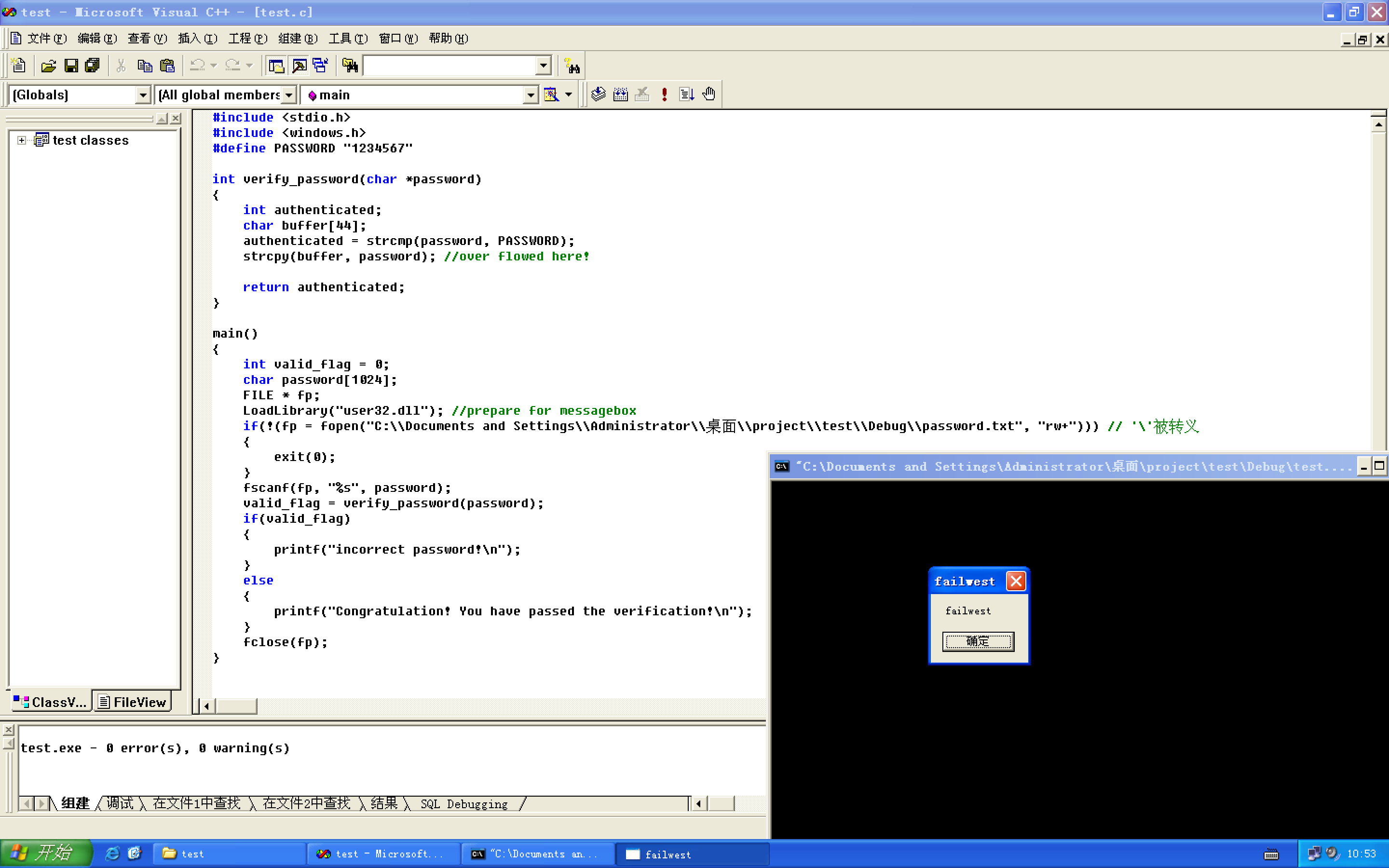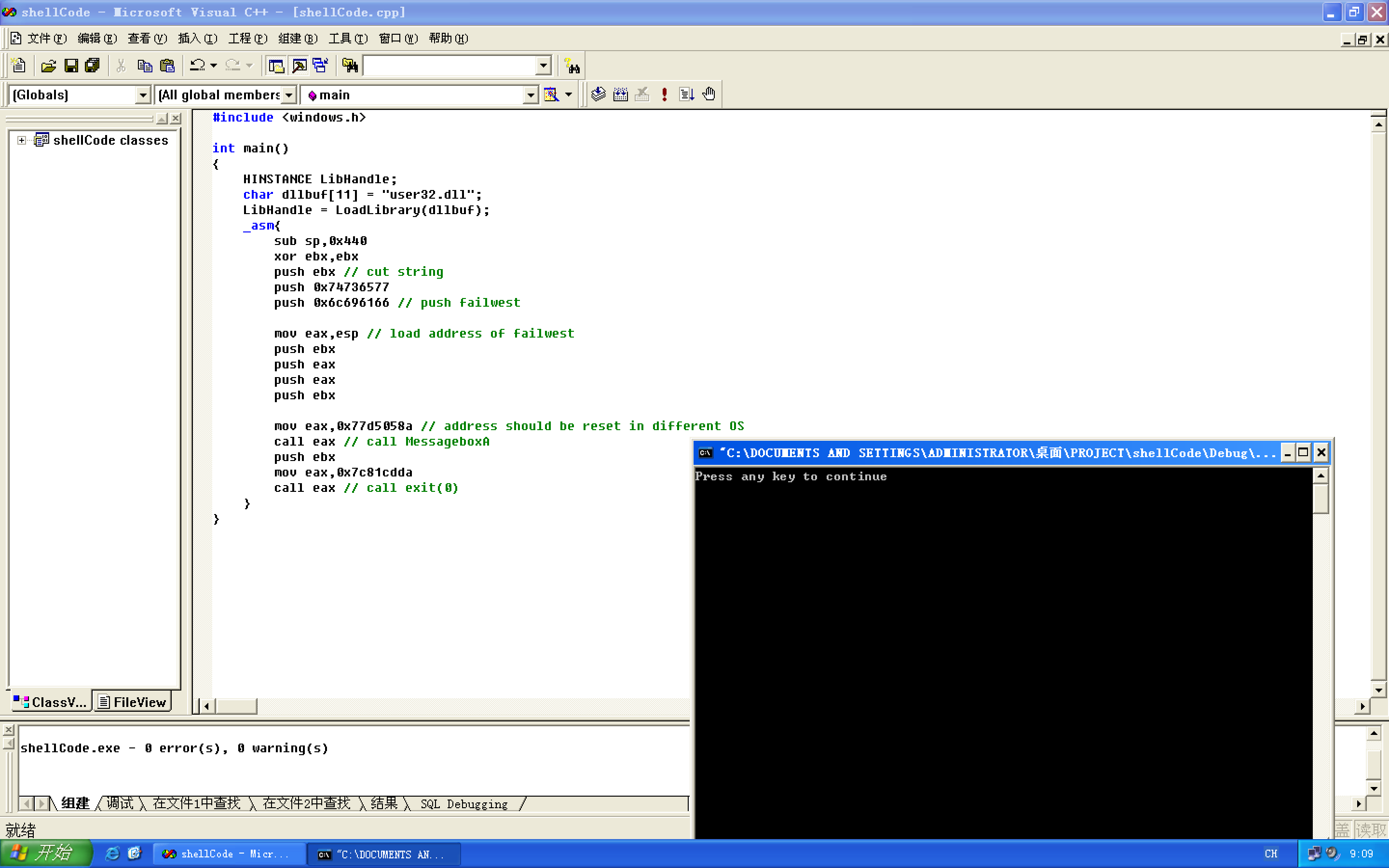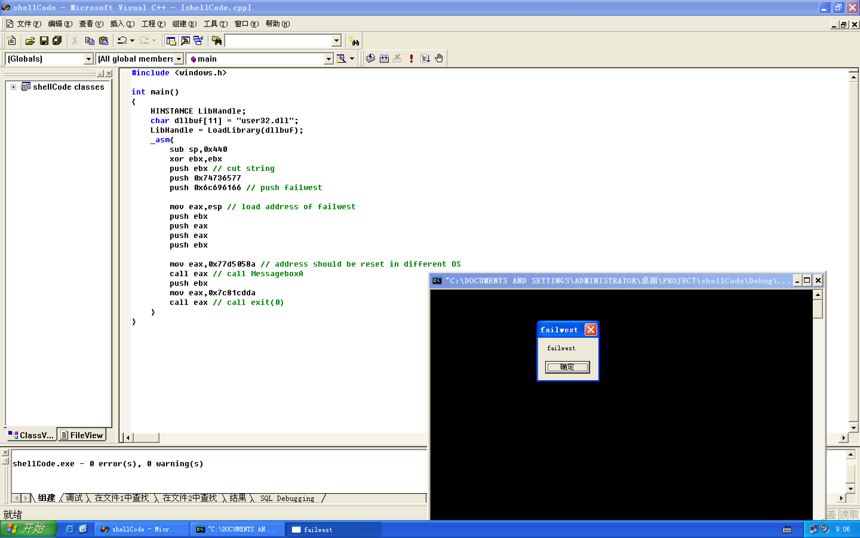 #include <windows.h> int main() { HINSTANCE LibHandle; char dllbuf[11] = "user32.dll"; LibHandle = LoadLibrary(dllbuf); _asm{ sub sp,0x440 xor ebx,ebx push ebx // cut string push 0x74736577 push 0x6c696166 // push failwest mov eax,esp // load address of failwest push ebx push eax push eax push ebx mov eax,0x77d5058a // address should be reset in different OS call eax // call MessageboxA push ebx mov eax,0x7c81cdda call eax // call exit(0) } }将shellCode.c文件在vc6.0中编译运行。