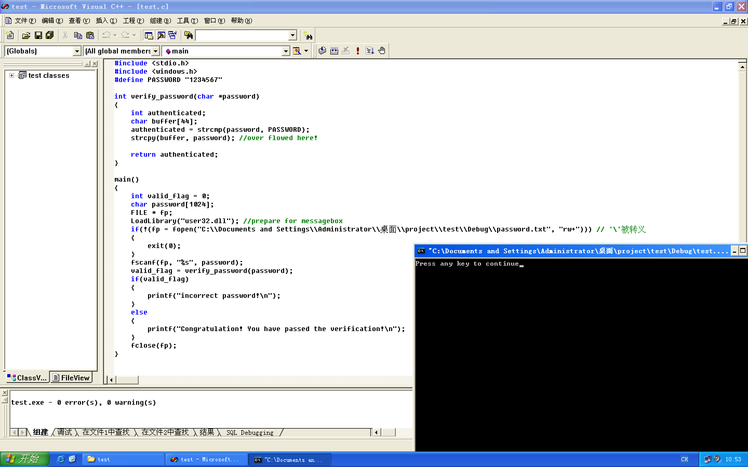 现在再运行密码验证程序,怎么样,程序退出的时候不会报内存错误了吧。虽然还是同样的消息框,但是这次植入代码的流程和 2.4 节中已有很大不同了,最核心的地方就是使用了跳转地址定位 shellcode。运行结果截图如下