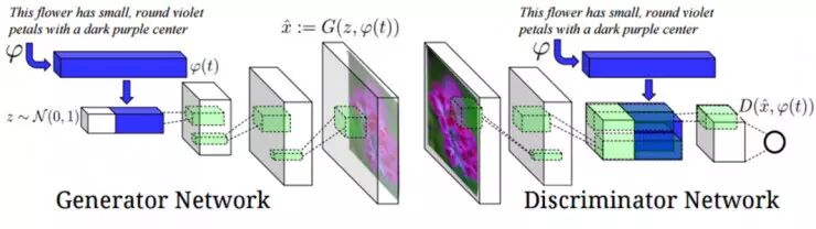 为实现这些目标,生成器和判别器都使用了文字编码技术:通过循环文字编码器(recurrent text encoder)生成的文字属性,来作为条件对 GAN 进行训练。这使得 GAN 能够在输入的文字描述和输出图像之间建立相关性联系。