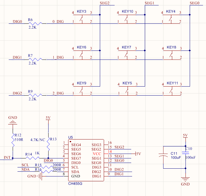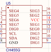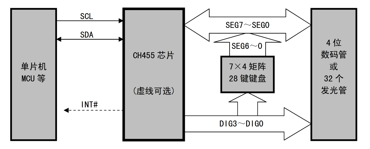 CH455是数码管显示驱动和键盘扫描控制芯片。CH455内置时钟振荡电路,可以动态驱动4位数码管或者32只LED;同时还可以进行28键的键盘扫描;CH455通过SCL和SDA组成的2线串行接口与单片机等交换数据。