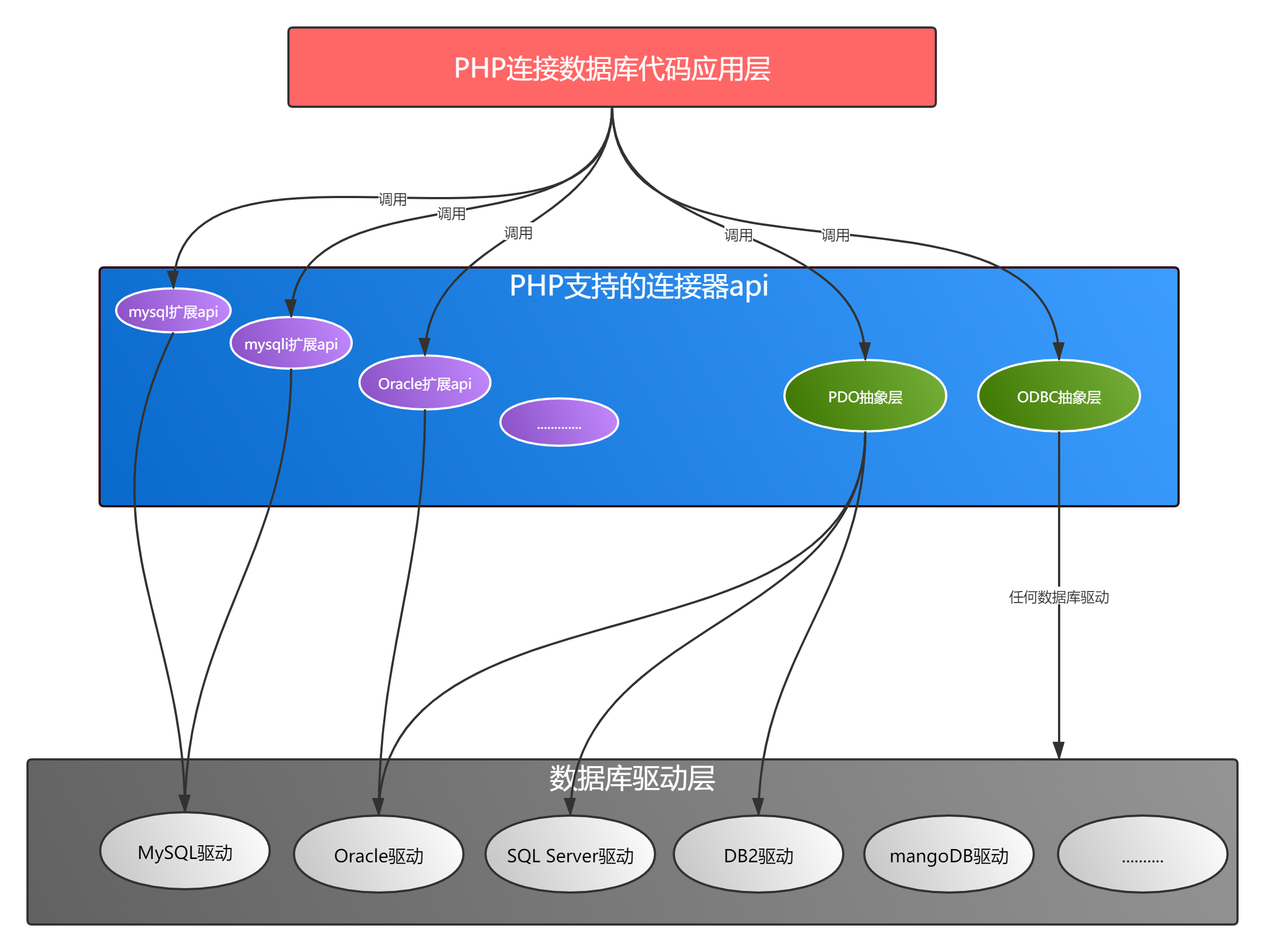 数据库驱动位于PHP和数据库进行通信的最底层,这一层就是数据库驱动层, 不同的数据库厂商都会在基于某个框架的前提下实现自己的驱动,用以提供基本功能、以及特定数据库的高级功能