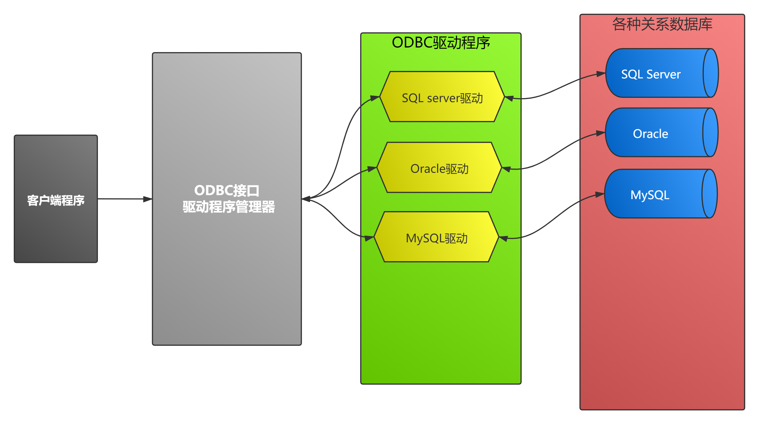 ODBC 是为客户应用程序访问关系数据库时提供的一个标准的接口、对于不同的数据库,ODBC 提供了统一的 API,使用该 API 来访问任何提供了 ODBC 驱动程序的数据库