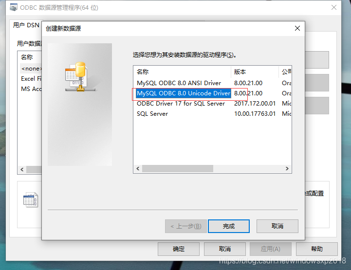 在【用户DSN】选项卡中单击【添加】按钮,然后选择MySQL ODBC 8.0 Unicode Driver 单击完成!
