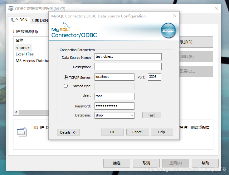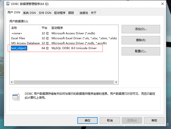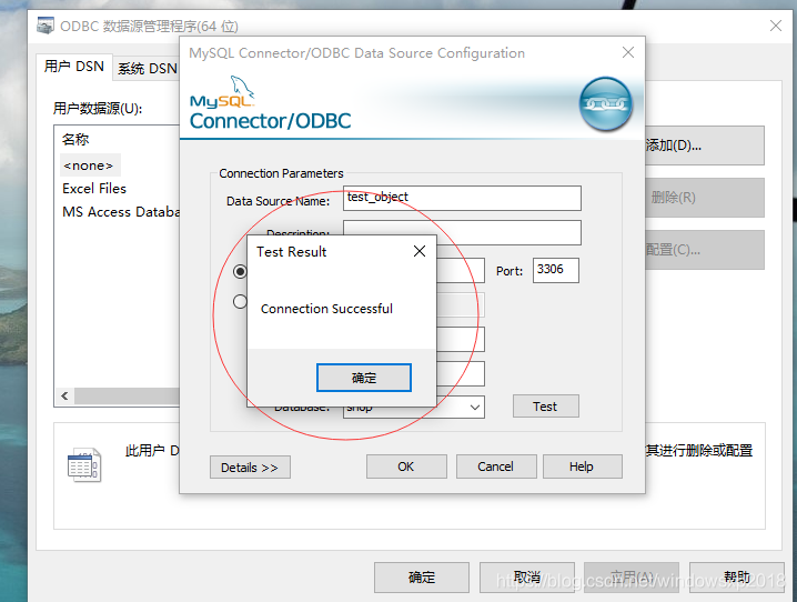若测试成功,再点击 OK 按钮即可!在用户DSN处即可查看到最新创建的ODBC